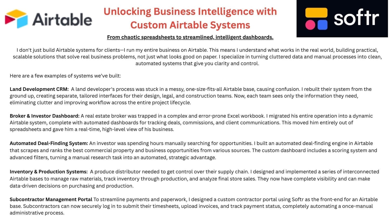 We architect a single source of truth for your entire operation. By replacing scattered spreadsheets and disconnected apps with a custom system built on Airtable or Softr and AI, we give you the clarity and control you need to make smarter, faster decisions.